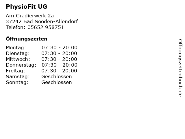 | Öffnungszeiten PhysioFit UG in Bad Sooden-Allendorf anzeigen | |