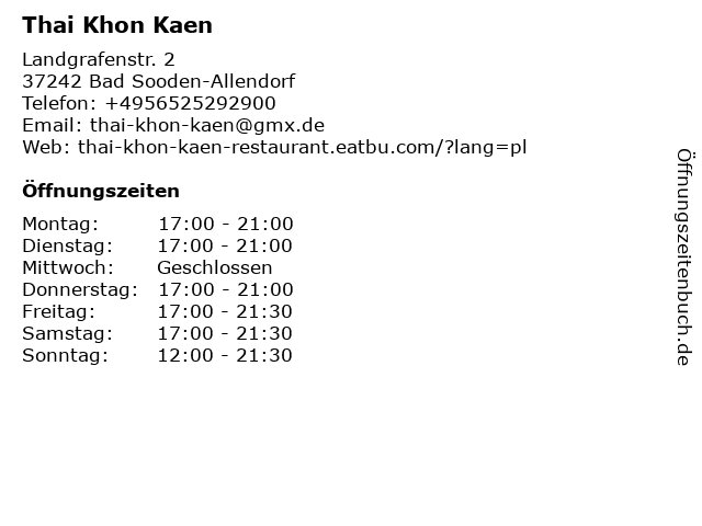 | Öffnungszeiten Thai Khon Kaen in Bad Sooden-Allendorf anzeigen | |