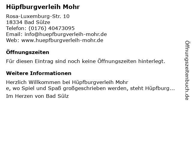 | Öffnungszeiten Hüpfburgverleih Mohr in Bad Sülze anzeigen | |