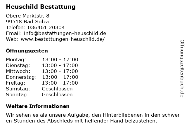 | Öffnungszeiten Heuschild Bestattung in Bad Sulza anzeigen | |