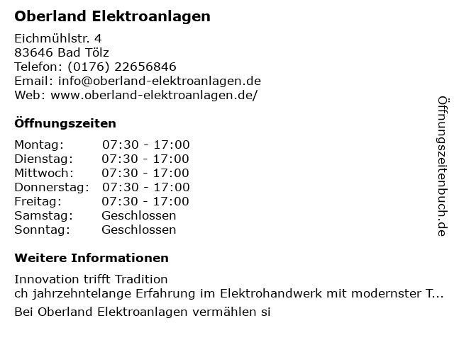 | Öffnungszeiten Oberland Elektroanlagen in Bad Tölz anzeigen | |