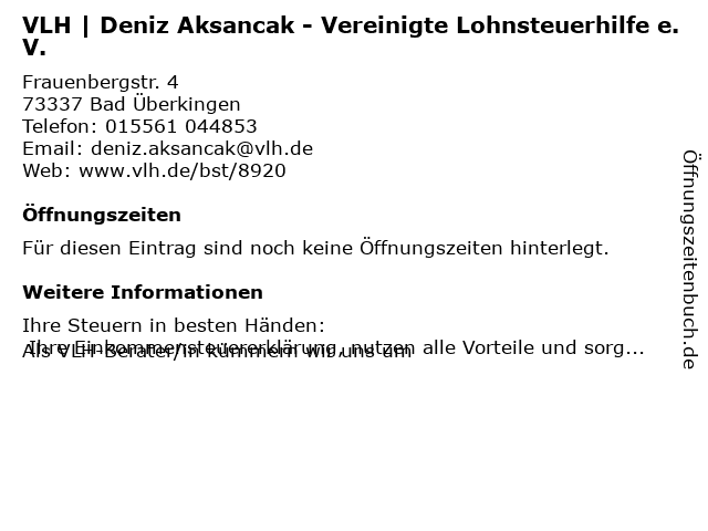 Branchen & Suchbegriffe zu VLH | Deniz Aksancak - Vereinigte Lohnsteuerhilfe e.V.:aksancak, deniz, e.v., lohnsteuerhilfe, vereinigte, vlh |