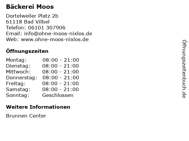 Öffnungszeiten Bäckerei Moos in Bad Vilbel anzeigen | |