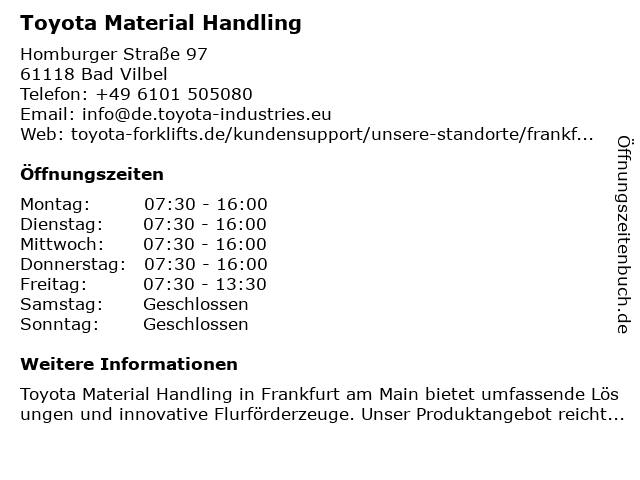 | Öffnungszeiten Toyota Material Handling in Bad Vilbel anzeigen | |