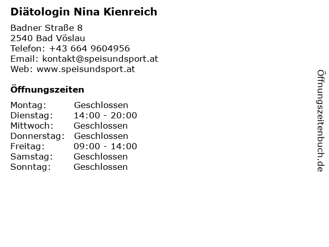 5 Mag. Nina Kienreich Diätologin & Ernährungswissenschaftlerin (Entfernung: 5,68 km) Germergasse 41, 2500 Baden 6 |
