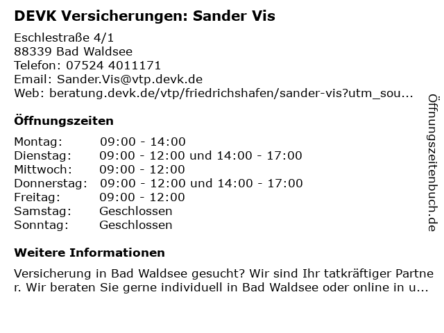 2 DEVK Versicherungen: Lara-Anjuli Feltrin (Berater*in ausgeschieden) (Entfernung: 0,01 km) Eschlestr. 4/1, 88339 Bad Waldsee 4 DEVK Versicherung Ralf Geiß Bereichsleiter (Entfernung: 19,32 km) Charlottenstraße 14, 88212 Ravensburg 6 |
