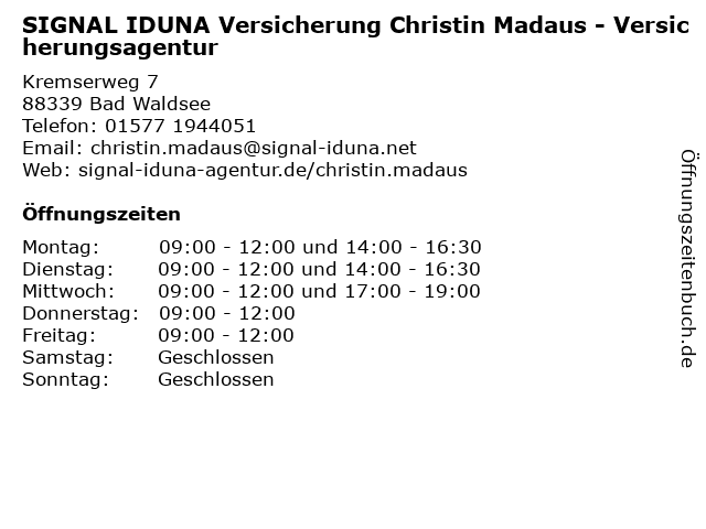 1 SIGNAL IDUNA Versicherung Gabriel Bukarz - Versicherungsagentur (Entfernung: 0,00 km) Kremserweg 7, 88339 Bad Waldsee (Reute) 2 SIGNAL IDUNA Versicherung Heiko Gscheidle - Versicherungsagentur (Entfernung: 0,01 km) Kremserweg 7, 88339 Bad Waldsee 6 SIGNAL IDUNA Versicherung Henry Heß - Versicherungsagentur (Entfernung: 14,18 km) Panoramaweg 14, 88361 Eichstegen |