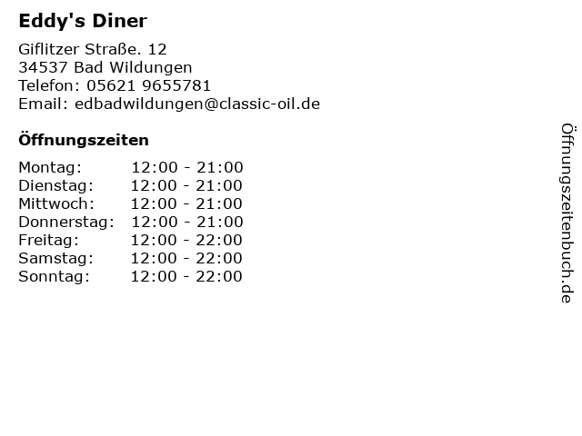 | Öffnungszeiten Eddy's Diner in Bad Wildungen anzeigen | |