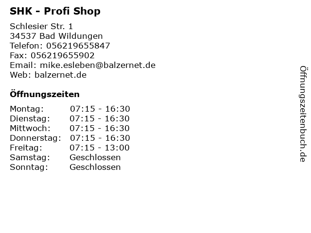 | Öffnungszeiten SHK - Profi Shop in Bad Wildungen anzeigen | |