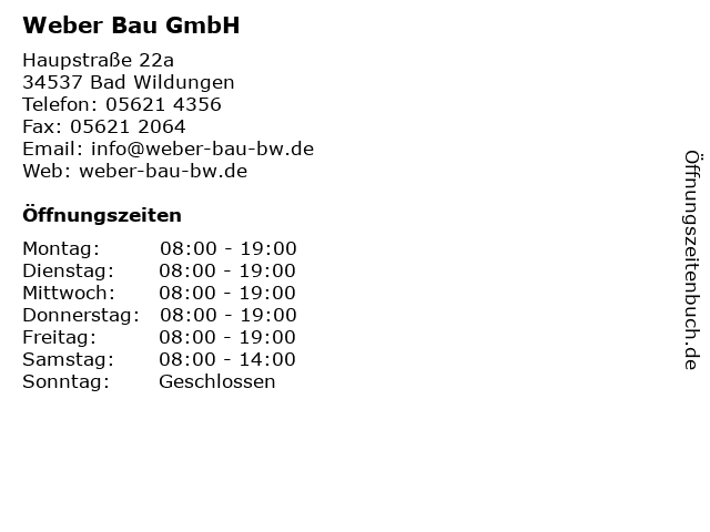 | Öffnungszeiten Weber Bau GmbH in Bad Wildungen anzeigen | |