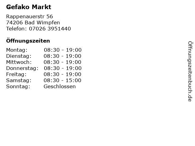 | Öffnungszeiten Gefako Markt in Bad Wimpfen anzeigen | |