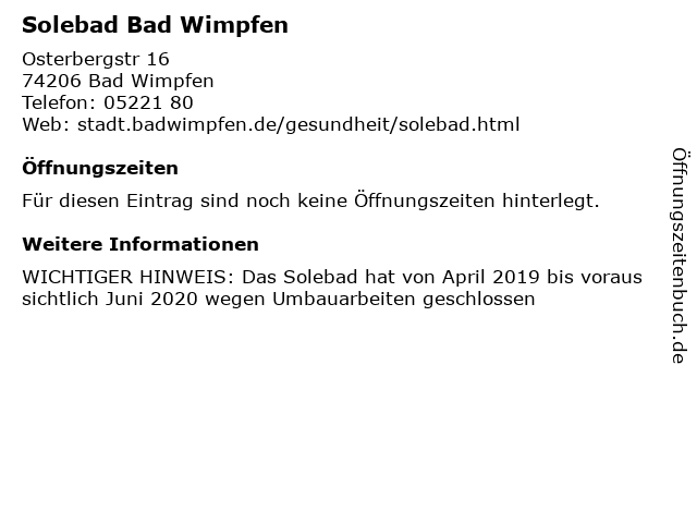 | Öffnungszeiten Solebad Bad Wimpfen in Bad Wimpfen anzeigen | |
