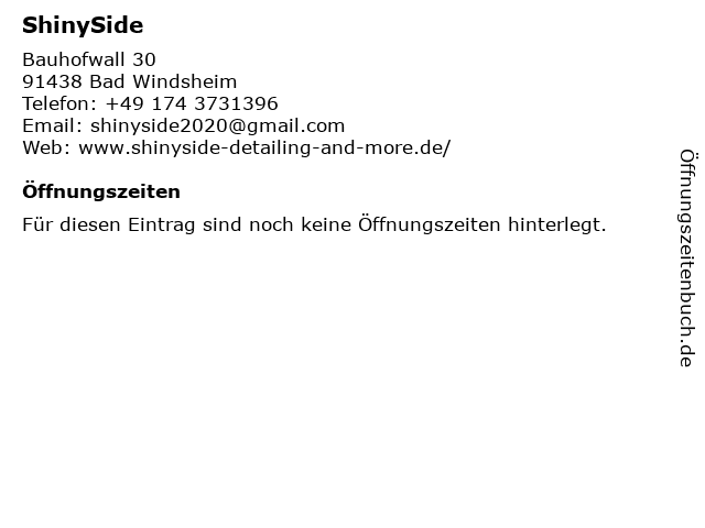 | Öffnungszeiten ShinySide in Bad Windsheim anzeigen | |
