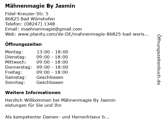 | Öffnungszeiten Mähnenmagie By Jasmin in Bad Wörishofen anzeigen | |