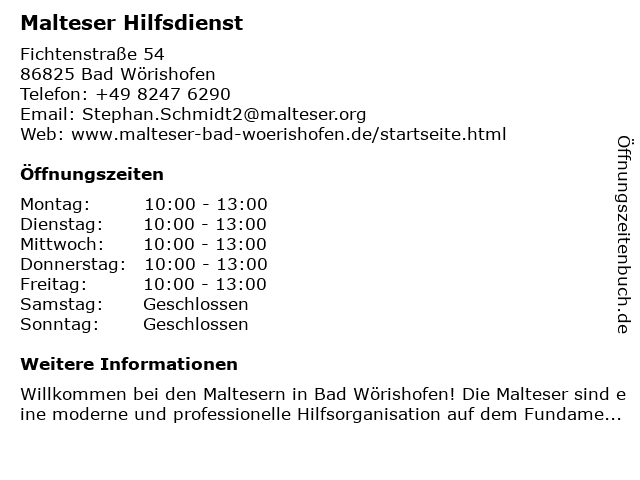 | Öffnungszeiten Malteser Hilfsdienst in Bad Wörishofen anzeigen | |