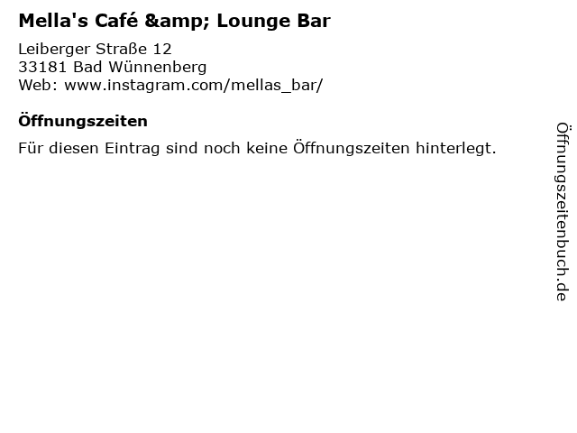 | Öffnungszeiten Mella's Café & Lounge Bar in Bad Wünnenberg anzeigen | |
