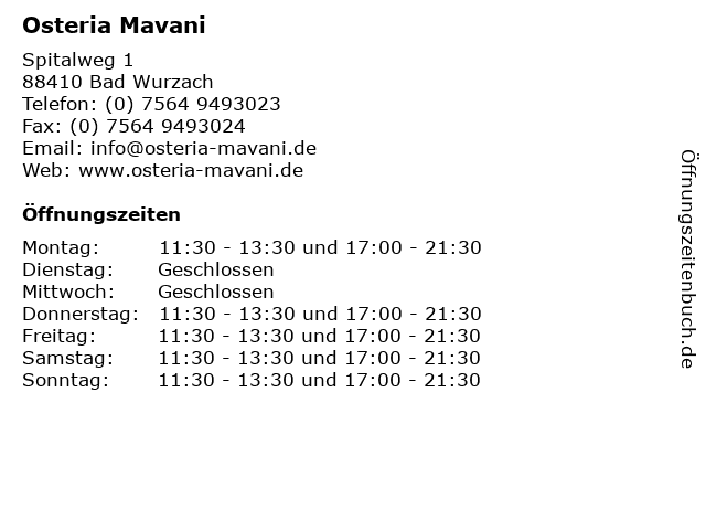 | Öffnungszeiten Osteria Mavani in Bad Wurzach anzeigen | |