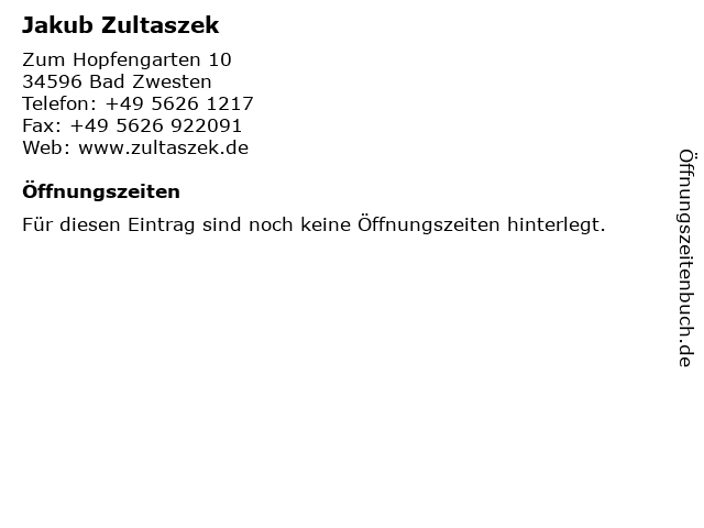 | Öffnungszeiten Jakub Zultaszek in Bad Zwesten anzeigen | |