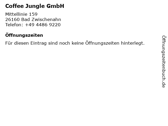 | Öffnungszeiten Coffee Jungle GmbH in Bad Zwischenahn anzeigen | |