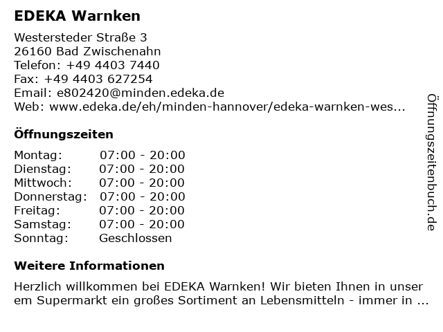 | Öffnungszeiten EDEKA Warnken in Bad Zwischenahn anzeigen | |