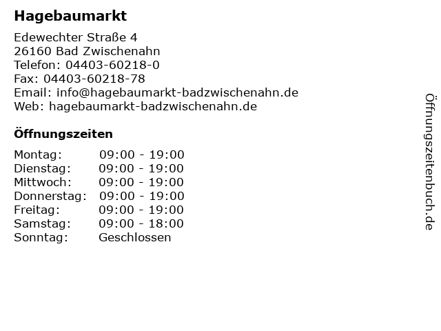 | Öffnungszeiten Hagebaumarkt in Bad Zwischenahn anzeigen | |