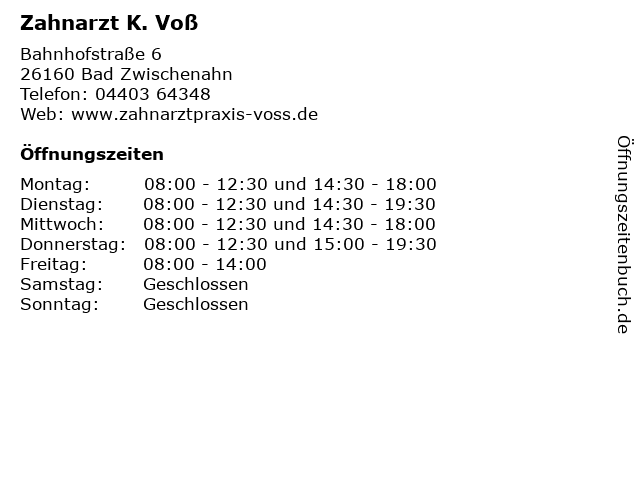| Öffnungszeiten Zahnarzt K. Voß in Bad Zwischenahn anzeigen | |