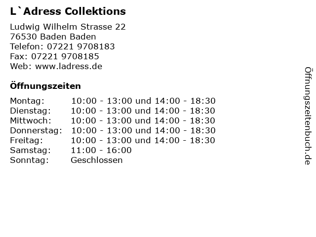 | Öffnungszeiten L`Adress Collektions in Baden Baden anzeigen | |