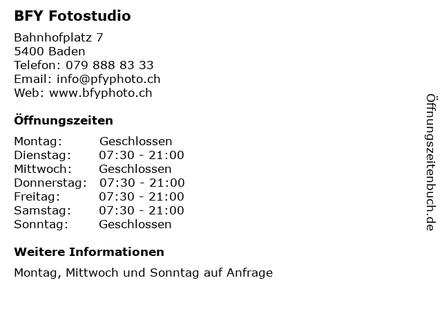 | Öffnungszeiten BFY Fotostudio in Baden anzeigen | |