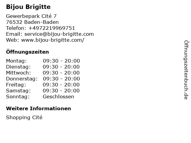 | Öffnungszeiten Bijou Brigitte in Baden-Baden anzeigen | |