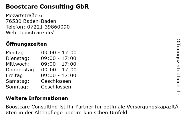 | Öffnungszeiten Boostcare Consulting GbR in Baden-Baden anzeigen | |