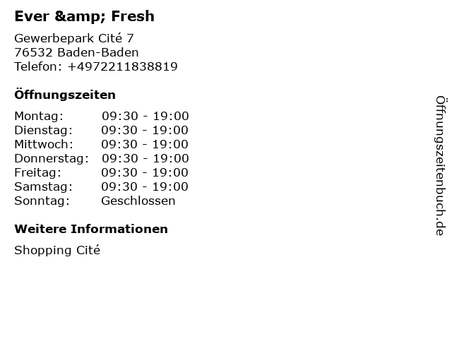 | Öffnungszeiten Ever & Fresh in Baden-Baden anzeigen | |