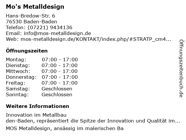| Öffnungszeiten Mo's Metalldesign in Baden-Baden anzeigen | |