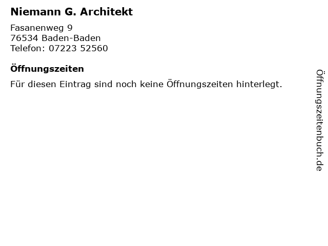 | Öffnungszeiten Niemann G. Architekt in Baden-Baden anzeigen | |