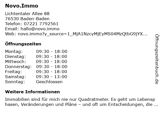 | Öffnungszeiten Novo.Immo in Baden-Baden anzeigen | |