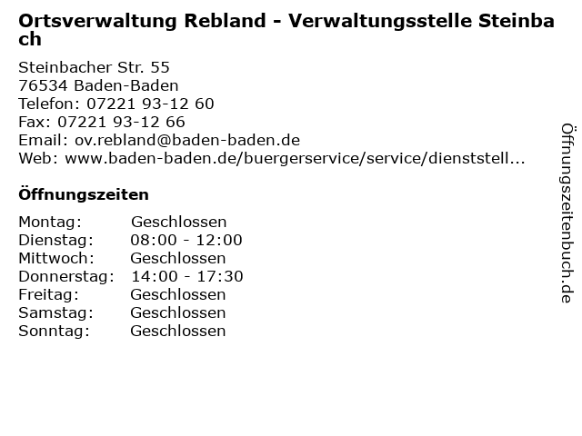 1 Ortsverwaltung Rebland - Verwaltungsstelle Steinbach (Entfernung: 0,00 km) Steinbacher Str. 55, 76534 Baden-Baden 6 |