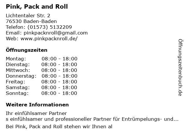 | Öffnungszeiten Pink, Pack and Roll in Baden-Baden anzeigen | |