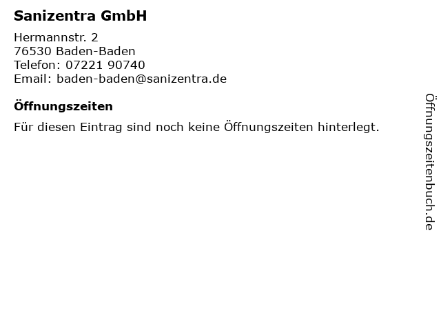 | Öffnungszeiten Sanizentra GmbH in Baden-Baden anzeigen | |
