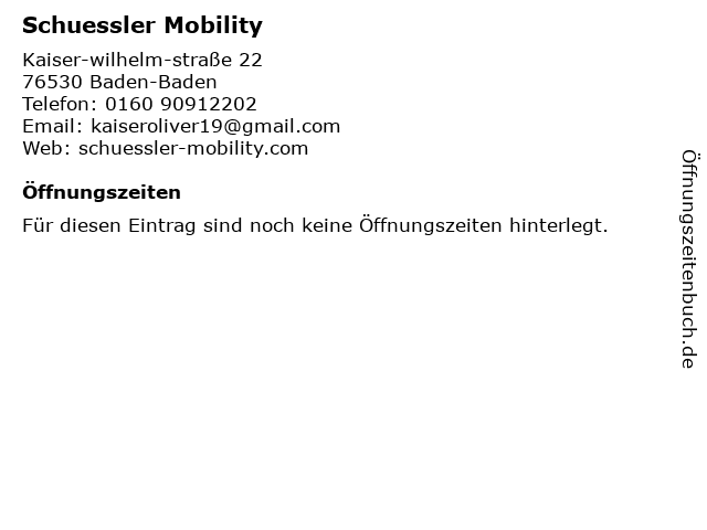 | Öffnungszeiten Schuessler Mobility in Baden-Baden anzeigen | |
