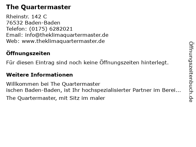 | Öffnungszeiten The Quartermaster in Baden-Baden anzeigen | |