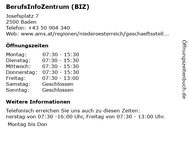 | Öffnungszeiten BerufsInfoZentrum (BIZ) in Baden anzeigen | |