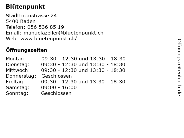 | Öffnungszeiten Blütenpunkt in Baden anzeigen | |