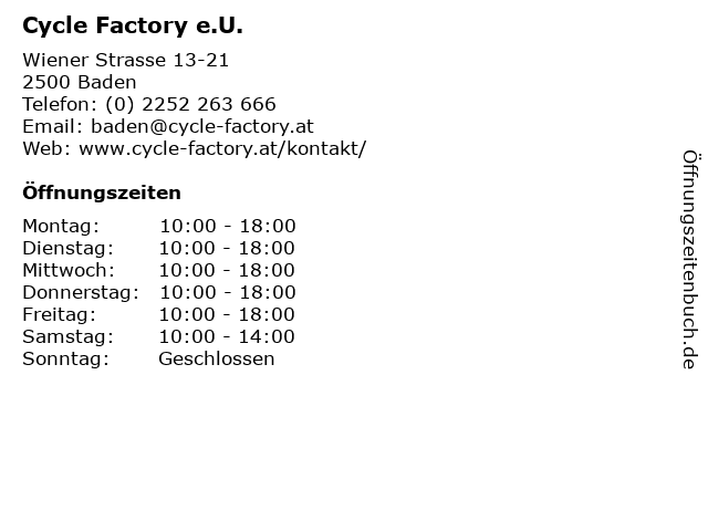| Öffnungszeiten Cycle Factory e.U. in Baden anzeigen | |