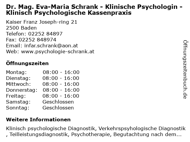 Branchen & Suchbegriffe zu Dr. Mag. Eva-Maria Schrank - Klinische Psychologin - Klinisch Psychologische Kassenpraxis:dr., eva, kassenpraxis, klinisch, klinische, mag., maria, psychologin, psychologische, psychotherapie, schrank |