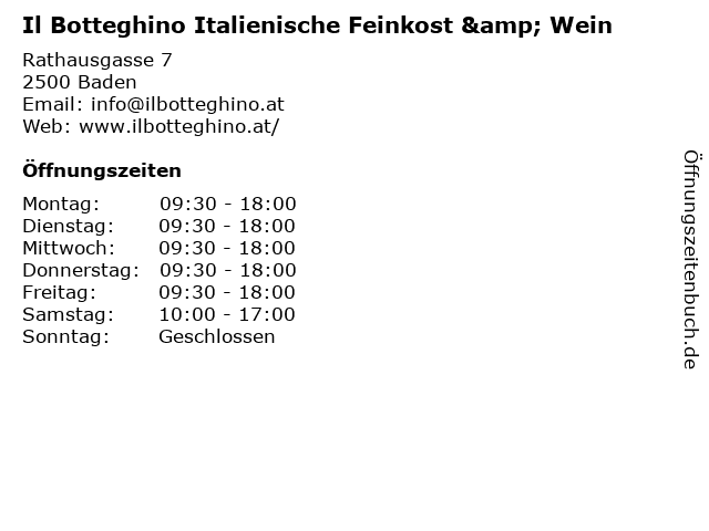 | Öffnungszeiten Il Botteghino Italienische Feinkost & Wein in Baden anzeigen | |