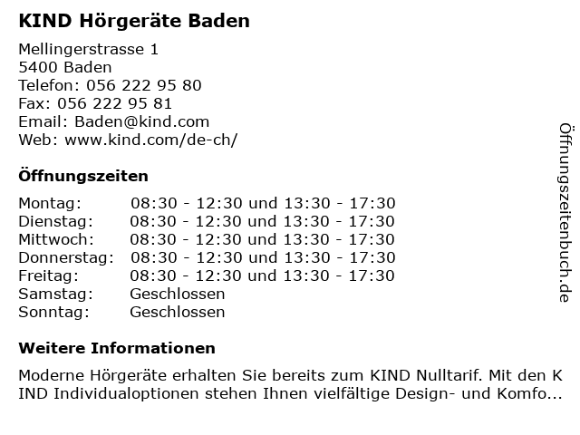| Telefonnummer KIND Hörgeräte Baden in Baden (056 222 95 80) anrufen | |