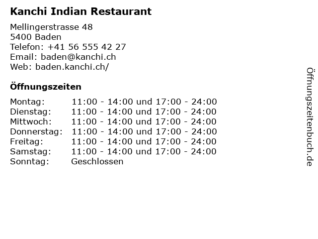 | Öffnungszeiten Kanchi Indian Restaurant in Baden anzeigen | |