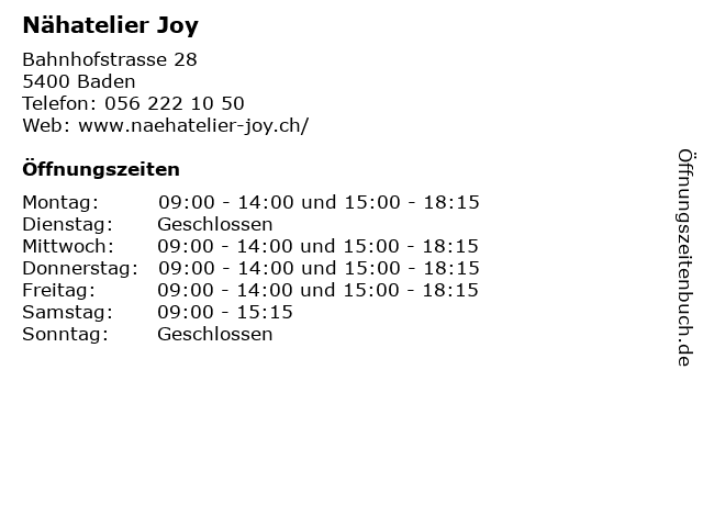 | Öffnungszeiten Nähatelier Joy in Baden anzeigen | |