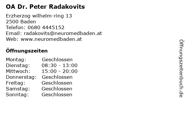 | Öffnungszeiten OA Dr. Peter Radakovits in Baden anzeigen | |