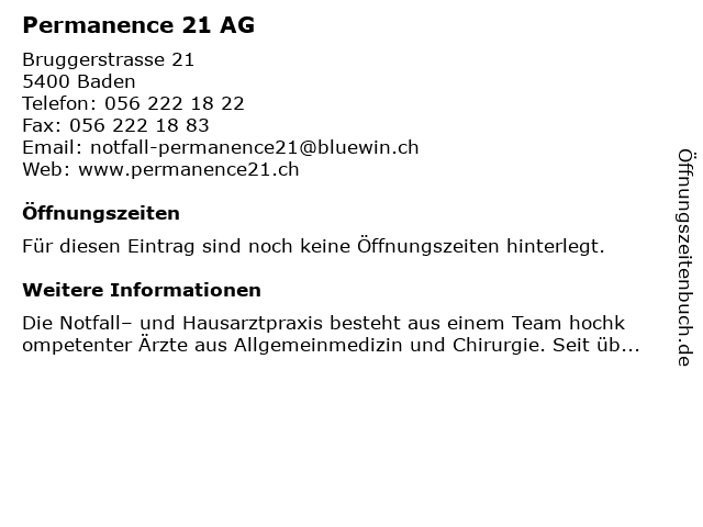 | Öffnungszeiten Permanence 21 AG in Baden anzeigen | |