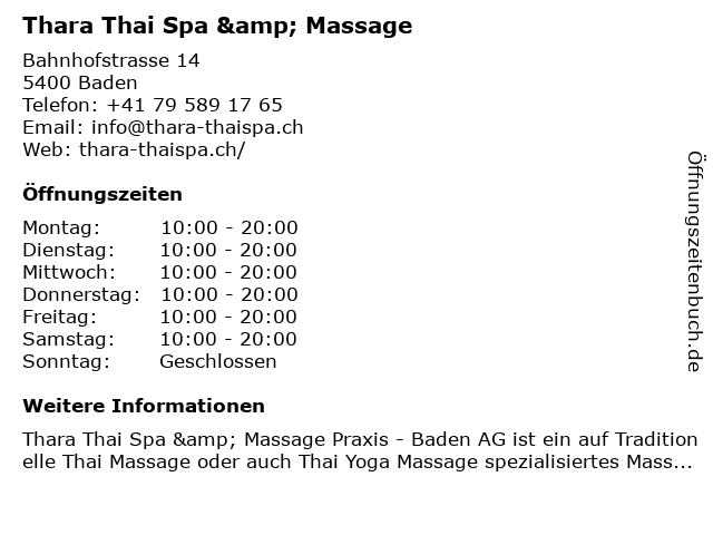 | Öffnungszeiten Thara Thai Spa & Massage in Baden anzeigen | |